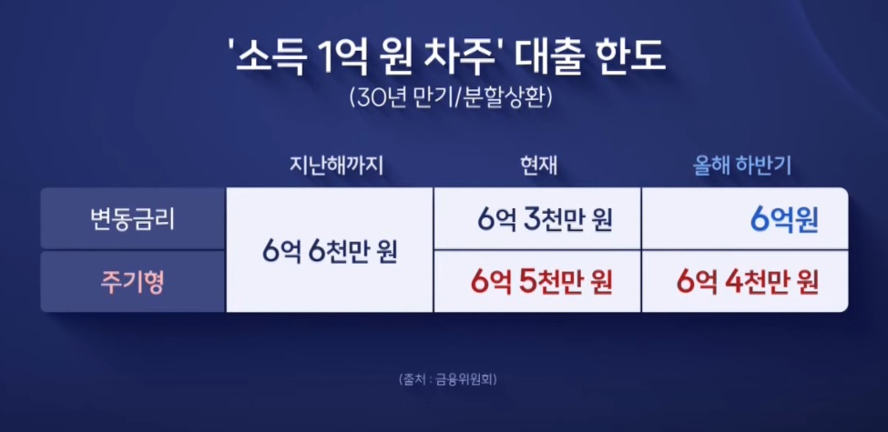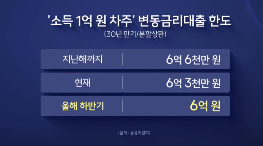 예를 들어 올 상반기 연소득 1억 원인 사람이 은행에서 변동금리로 30년 만기 주택담보대출을 받았다고 했을 때, 지금까지는 6억 3천만 원 정도까지 대출이 가능했는데, 7월부터는 3천만 원 더 줄어서 6억 원까지만 대출이 나오게 된다는 겁니다.