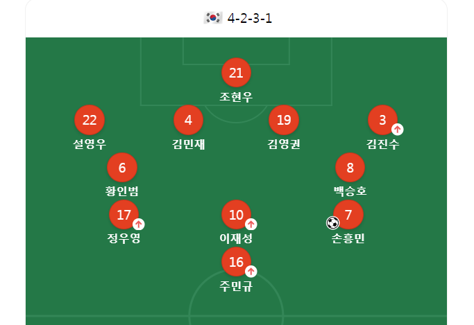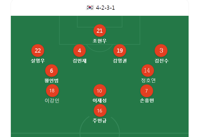 그리고 정우영 선수의 활약에도 아쉬움이 많이 남았습니다. 측면에서 설영우, 황인범 선수 등과 연계를 통해 상대 수비라인에 균열을 내려고 노력했지만 기대만큼 위협적이지 못했습니다. 황희찬 선수의 부상으로 1차전 선발명단에 이름 올린 것으로 보이는 정우영 선수의 엉성한 크로스나 위협적이지 못한 일대일 돌파 모습은 이번 2차전에서 이강인 선수로 대체하여 더욱 활발하고 정교한 킥으로 1차전의 아쉬움을 넘어설 것으로 예상됩니다.