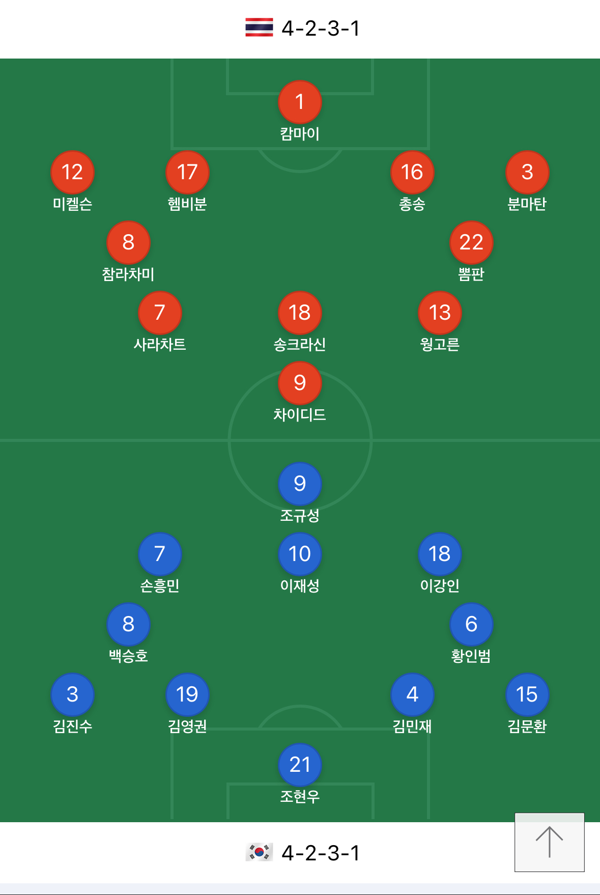 1차전 선발 라인업을 보면 공격력에 집중된 모습을 볼 수 있습니다. 특히 황인범과 백승호 선수는 공격적 성향이 강한 선수들인데 이 둘의 조합이 태국의 수비적 전술에서는 굉장한 힘을 발휘할 수 있었으나 예상치 못한 태국의 전방 압박에는 실수가 많아지며 위기의 순간도 맞았던 것이 사실입니다.
