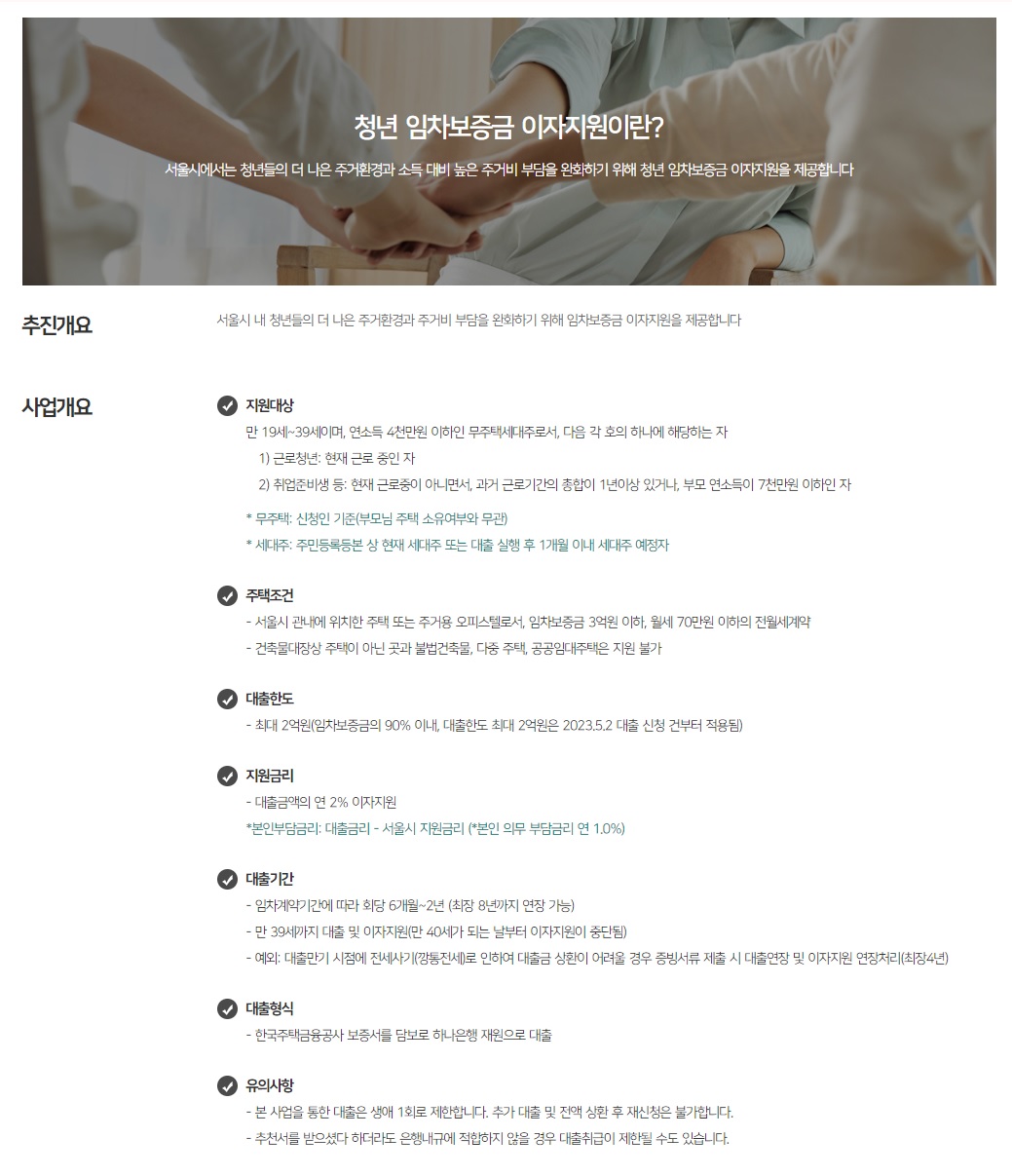 청년 임차보증금 이자지원은 서울시 내 청년들의 더 나은 주거환경과 주거비 부담을 완화하기 위해 임차보증금 이자지원을 제공합니다. 자세한 사항은 위 그림을 참조해 주세요.