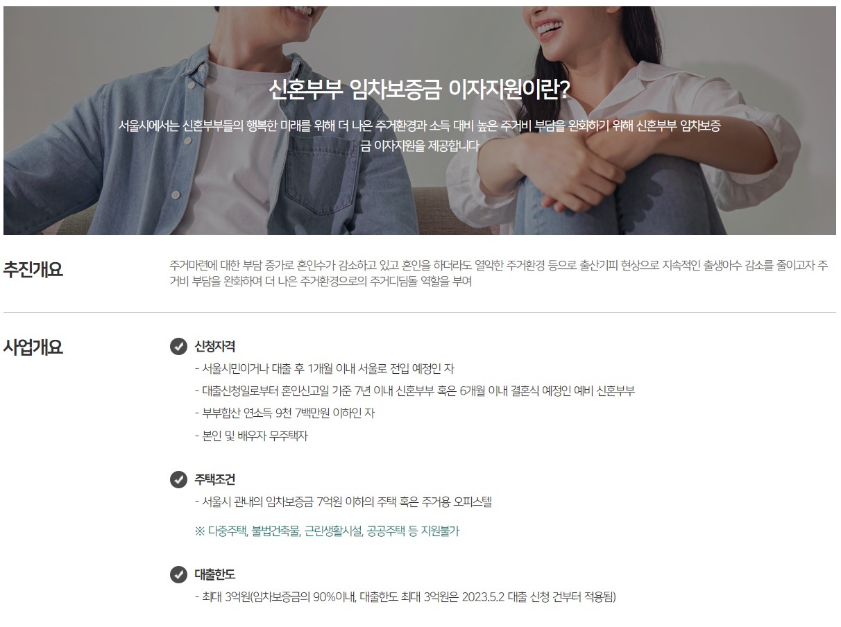 신혼부부 임차보증금 이자지원은 주거마련에 대한 부담 증가로 혼인수가 감소하고 있고 혼인을 하더라도 열약한 주거환경 등으로 출산기피 현상으로 출생아수 감소를 줄이고자 주거비 부담을 완화하여 더 나은 주거환경으로의 주거디딤돌 역할을 하기 위한 지원 서비스입니다. 자세한 사항은 위 그림을 참조해 주시기 바랍니다.