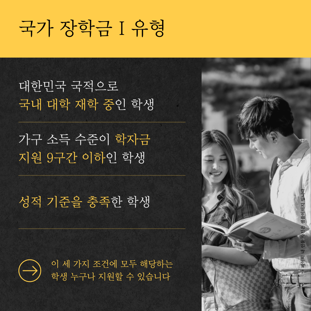 일반적으로 이야기하는 것은 국가 장학금 I 유형인데요. 대한민국 국적을 지니고 있고 국내 대학에 재학 중인 9구간 이하 대학생이라면 누구나 신청이 가능합니다. 여기에 기본적인 성적 기준을 충족해야 하고 해당 학기 국가 장학금 신청 절차를 완료한 후 소득 수준 파악이 돼야 합니다. 하지만 신청 조건에 부합한다면 반드시 신청해야 하겠죠?