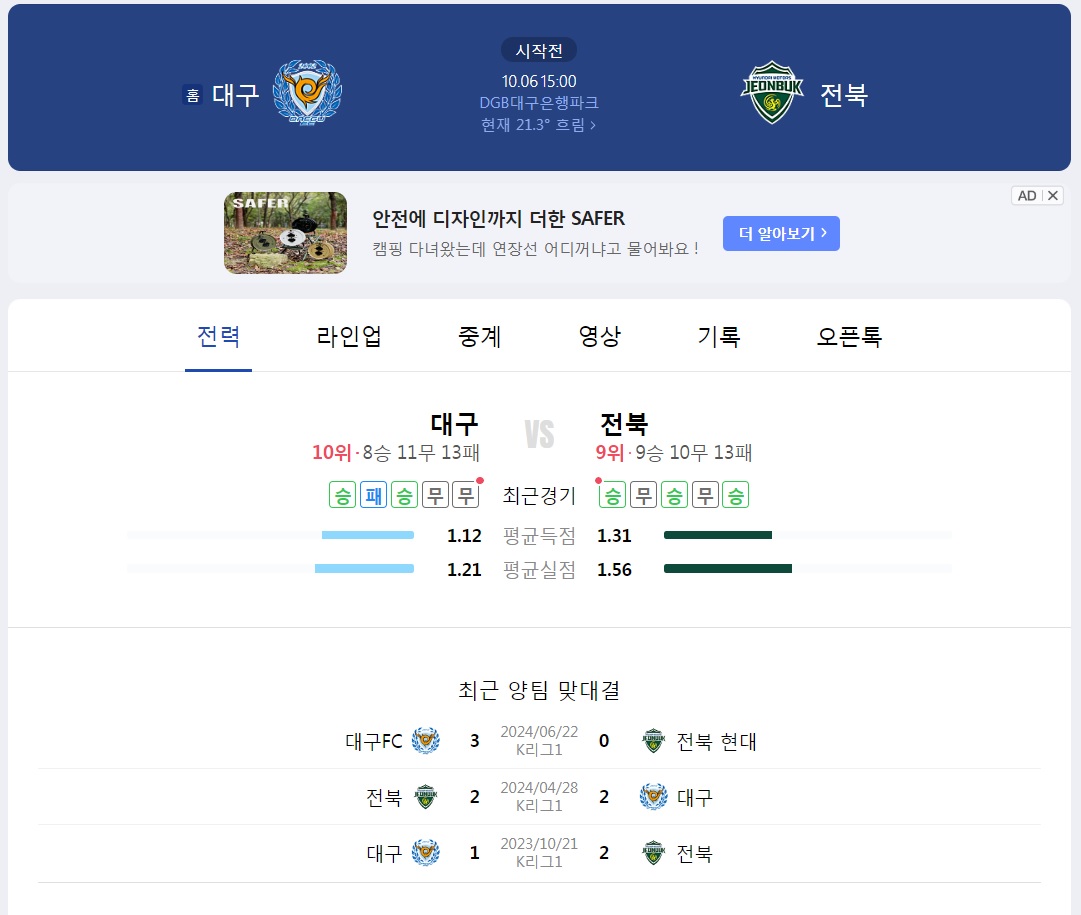 2024년 10월 06일(일) 오후 3시 대구와 전북의 경기가 대팍에서 열립니다.